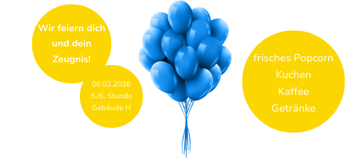 Am 6. Februar laden wir alle Schülerinnen und Schüler herzlich zu unserer Halbjahresfeier im Hauptgebäude ein. Die Feier findet in der 5. und 6. Stunde statt und bietet jede Menge Leckereien: Es gibt Kuchen, den unsere Lehrkräfte selbst gebacken haben, Popcorn und erfrischende Getränke. Kommt vorbei, genießt die gemeinsame Zeit mit euren Mitschülerinnen und Mitschülern und lasst uns gemeinsam auf eure Leistungen und Zeugnisse anstoßen. Wir feiern dich und dein Zeugnis!