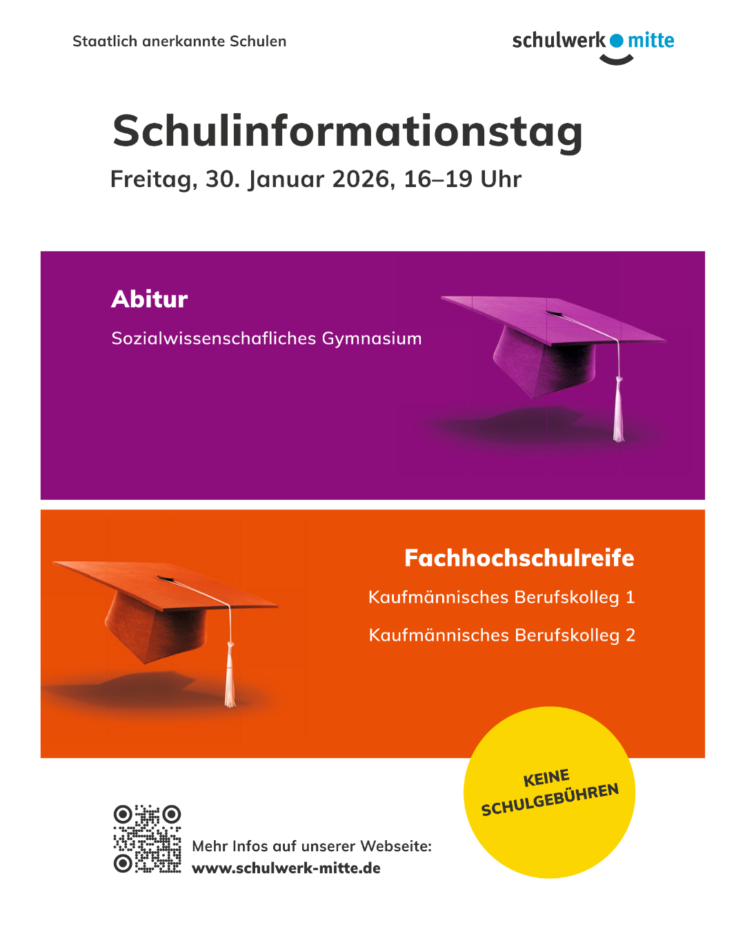 Im Anschluss folgen die Schulartenvorstellungen des Sozialwissenschaftlichen Gymnasiums sowie des Kaufmännischen Berufskollegs I & II – mit einer kurzen Schnupperstunde, in der du direkt Unterricht miterleben kannst. Danach bieten wir Schulführungen durch Räume und Fachbereiche an.